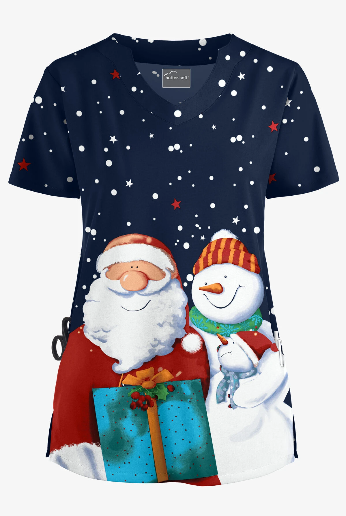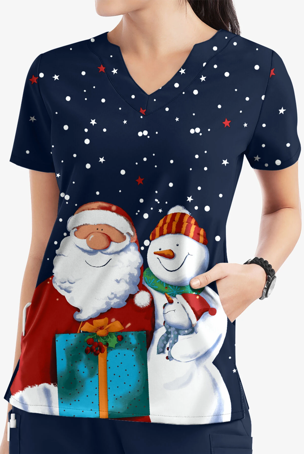 Butter-Soft Christmas Morning Navy Women’s 2-Pocket Scallop Neck Print Scrub Top
