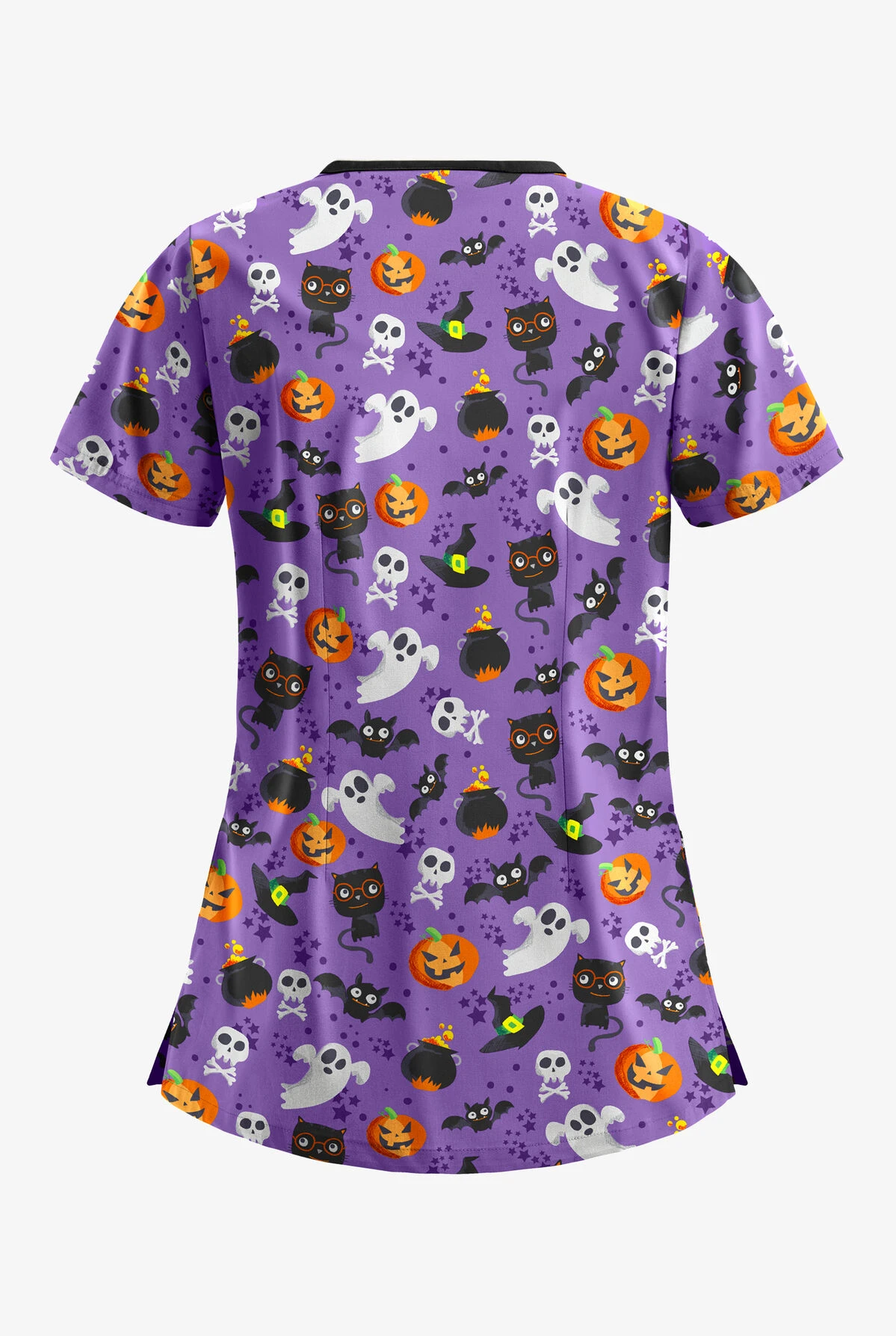 A classic V-neck women’s scrub top with a twist—a cool crisscross neckline. Sleek front pockets offer a divider stitch to hold your cell phone or instruments. A super scary print for Halloween. NOT! These ghosts and bats and pumpkins are pure fun.