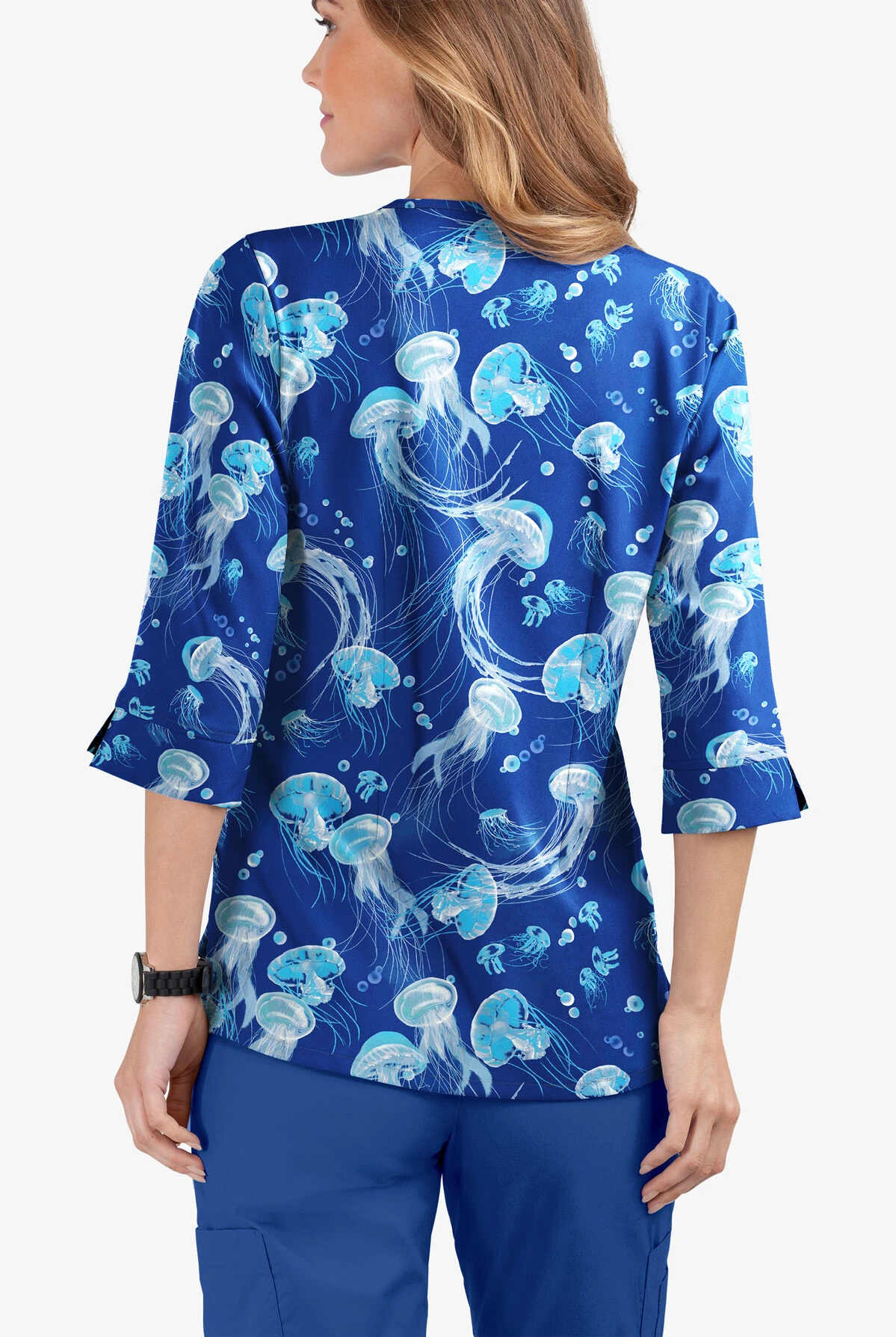 The Butter-Soft Serene Waters Galaxy Blue Women’s 4-Pocket 3/4 Sleeve Print Scrub Top features a round neckline with 3-button closure. Front and back darts give this fashion scrub top shape, while the 3/4 length sleeves with slits provide additional comfort. For storage, you’ll find 2 double front pockets. Side slits have been added to the hem for ease of mobility. Made of 97/3 Poly/Spandex.