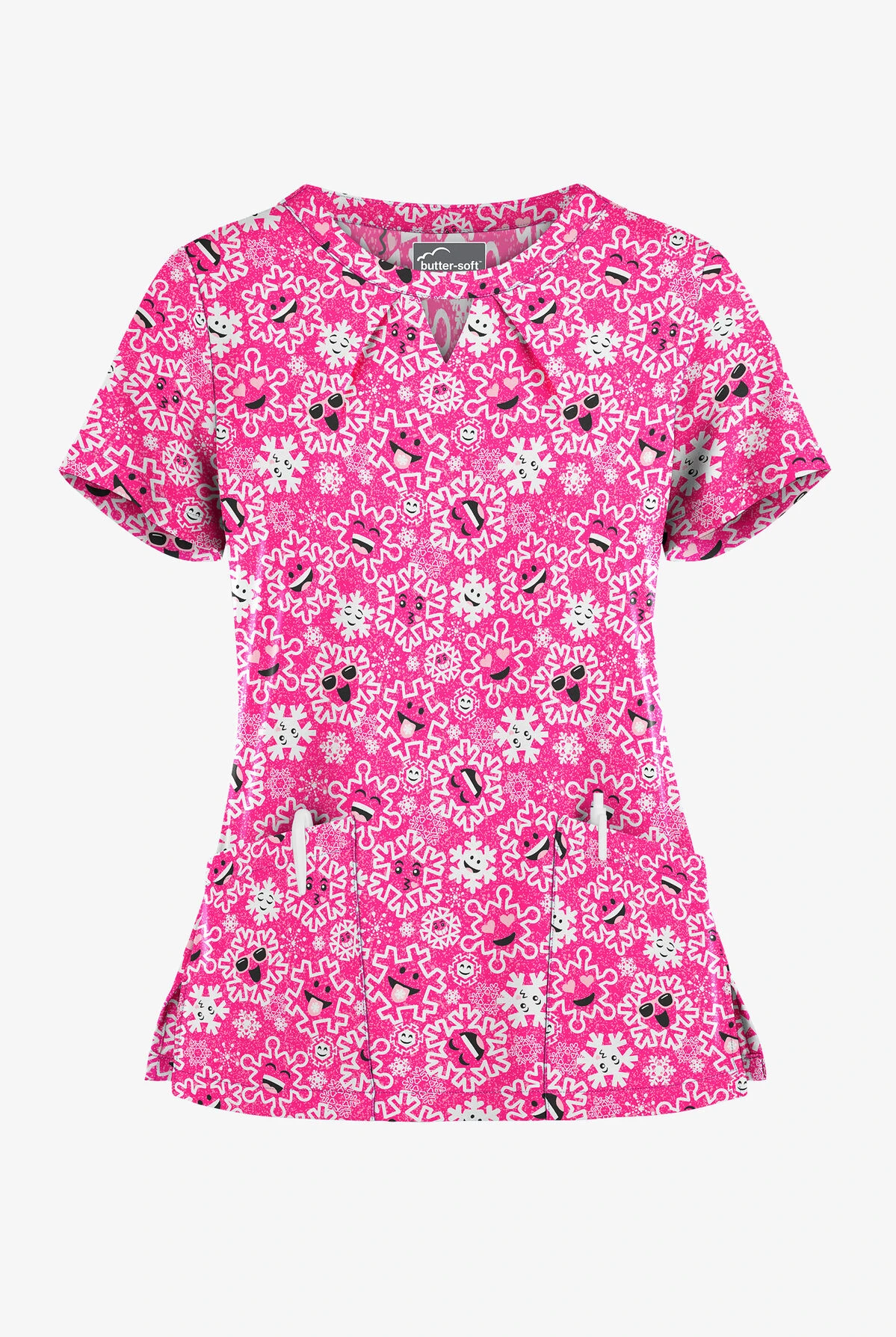 Butter-Soft Smiling Snowflakes Fuchsia Women’s 2-Pocket Keyhole V Neck Printed Scrub Top