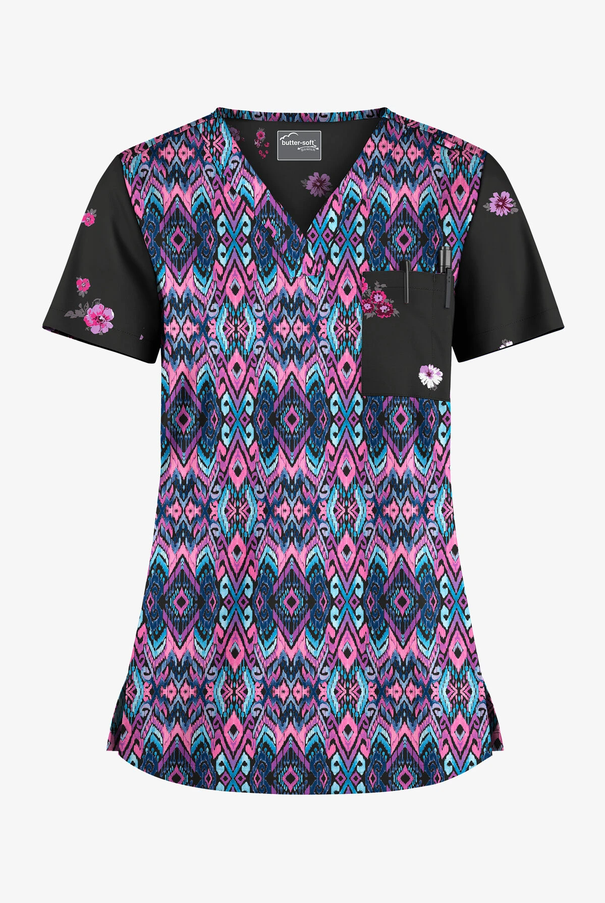 Our women’s scrub top is a V-neck shape, with a twist—the neckline has a slight curve and stitching that is both feminine and flattering. Simple, modern styling features a single front pocket. Each piece in our Butter-Soft STRETCH scrub collection was designed for 12+ hour shifts, and made from easy-care, 2-way stretch comfort fabric.
