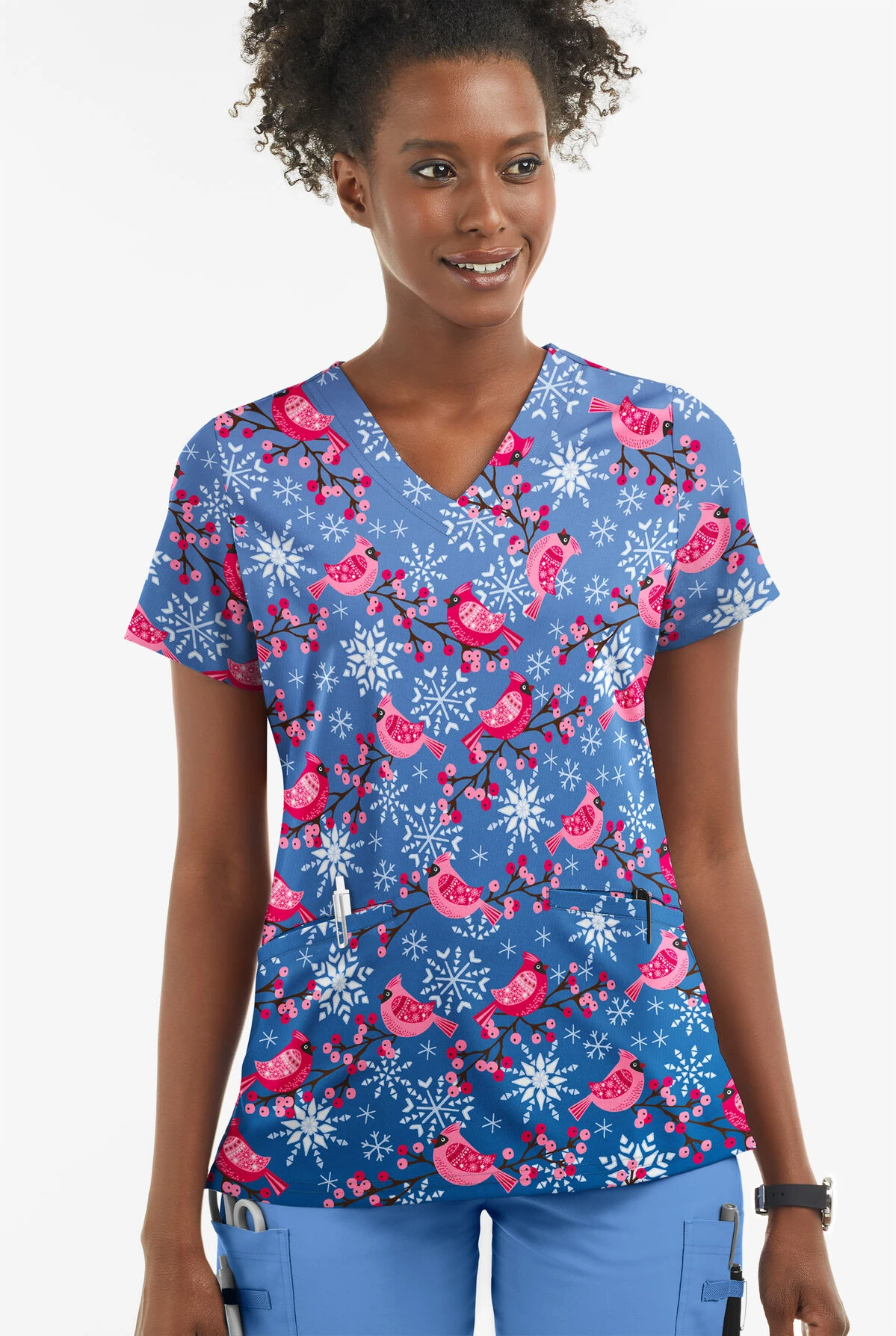 Butter-Soft Winter Finches Royal Women’s 2-Pocket With Angled Welt V-Neck Print Scrub Top