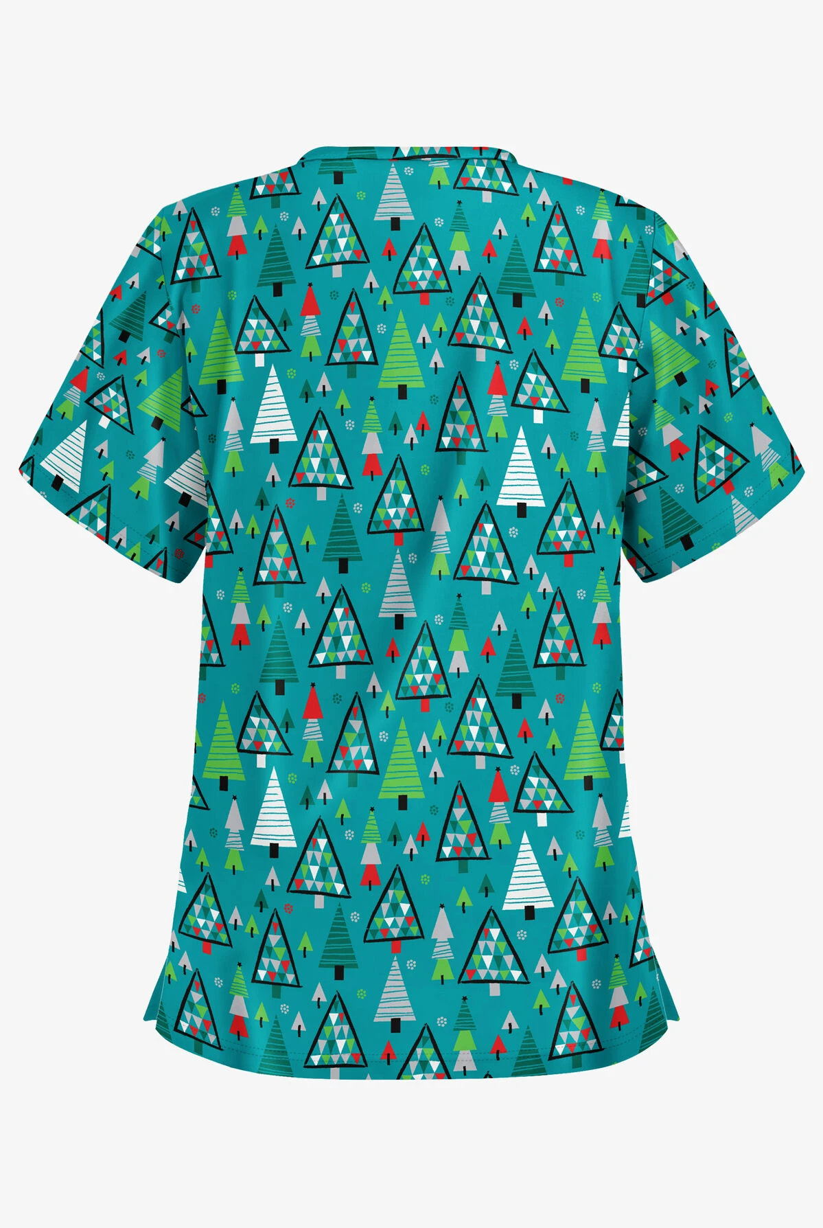 Butter-Soft X-Mas Park Teal Women’s 2-Pocket Relaxed Fit V-Neck Print Scrub Top