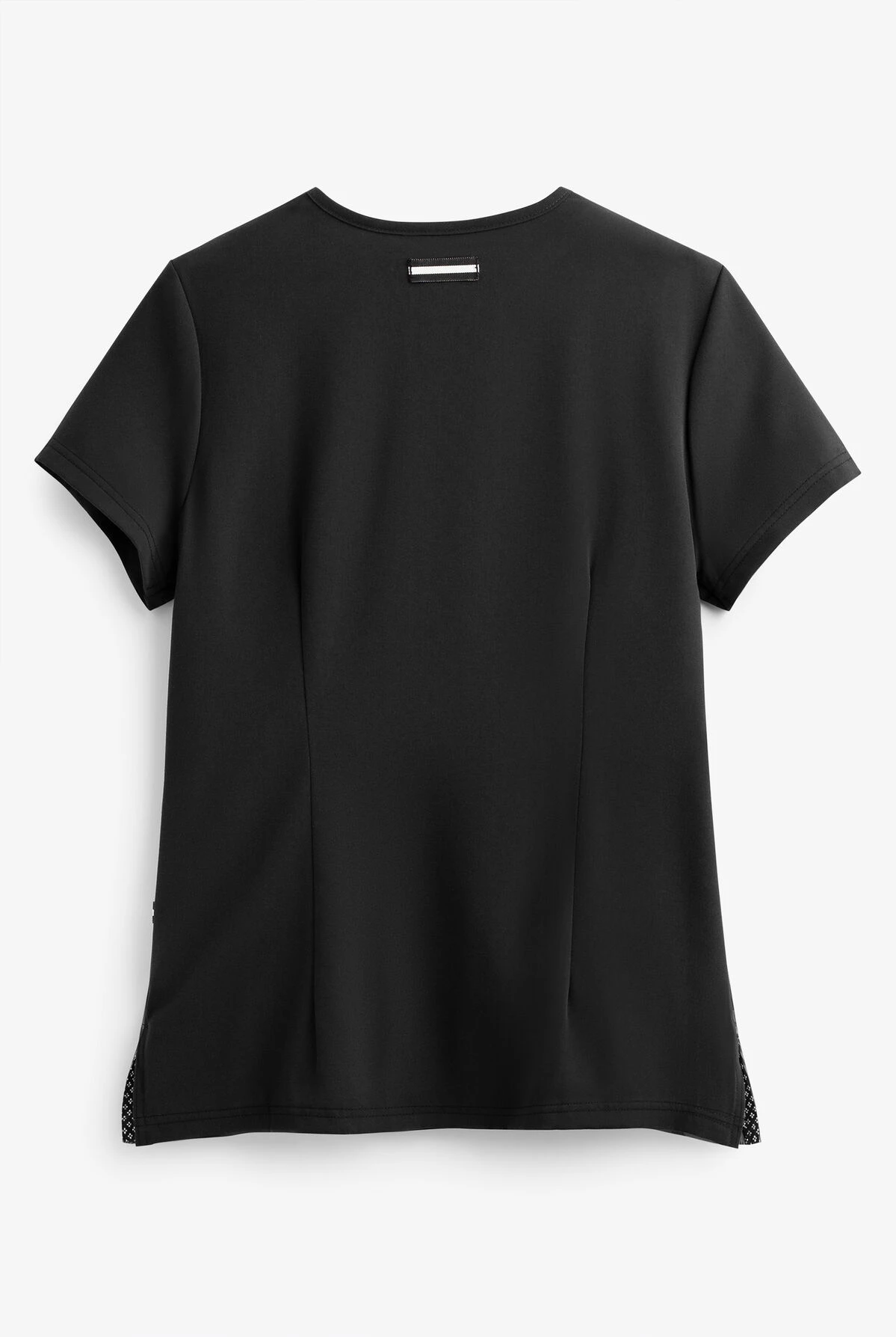 The koi Next Gen 1051-2 Better Than Ever Black V-Neck Print Scrub Top features a printed rib knit trimmed crossover V-neck, front shoulder yokes with a bungee ID loop on right, printed rib knit side front panels, side vents with foulard trim, back darts, black and white striped locker loop, and 3 pockets 2 front patch pockets with a printed snap closure slip pocket inside left. Fabric content is 73/22/5 poly/rayon/spandex, rib knit is 95/5 poly/spandex.