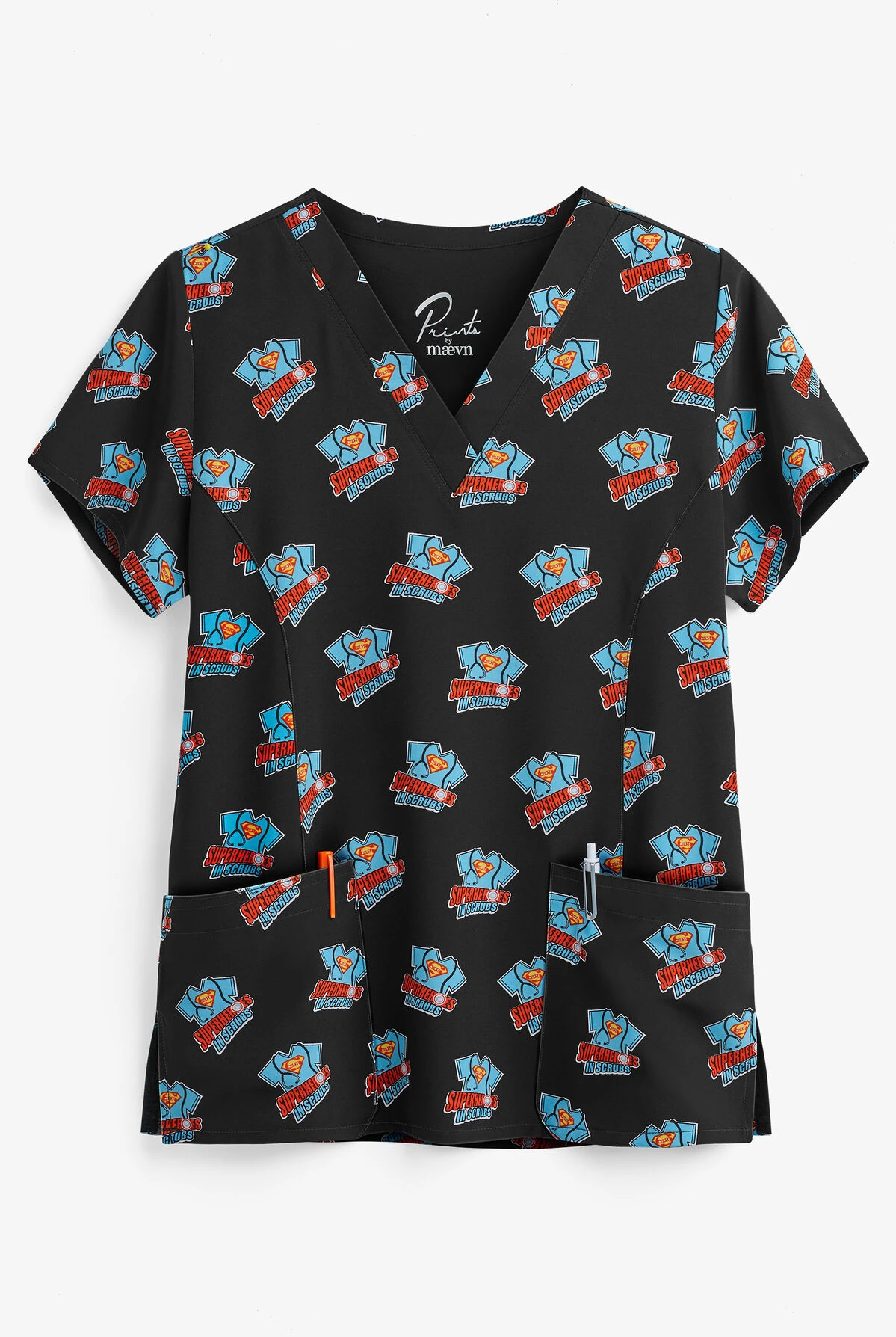 Maevn Superhero Women’s 3-Pocket V-Neck Print Scrub Top