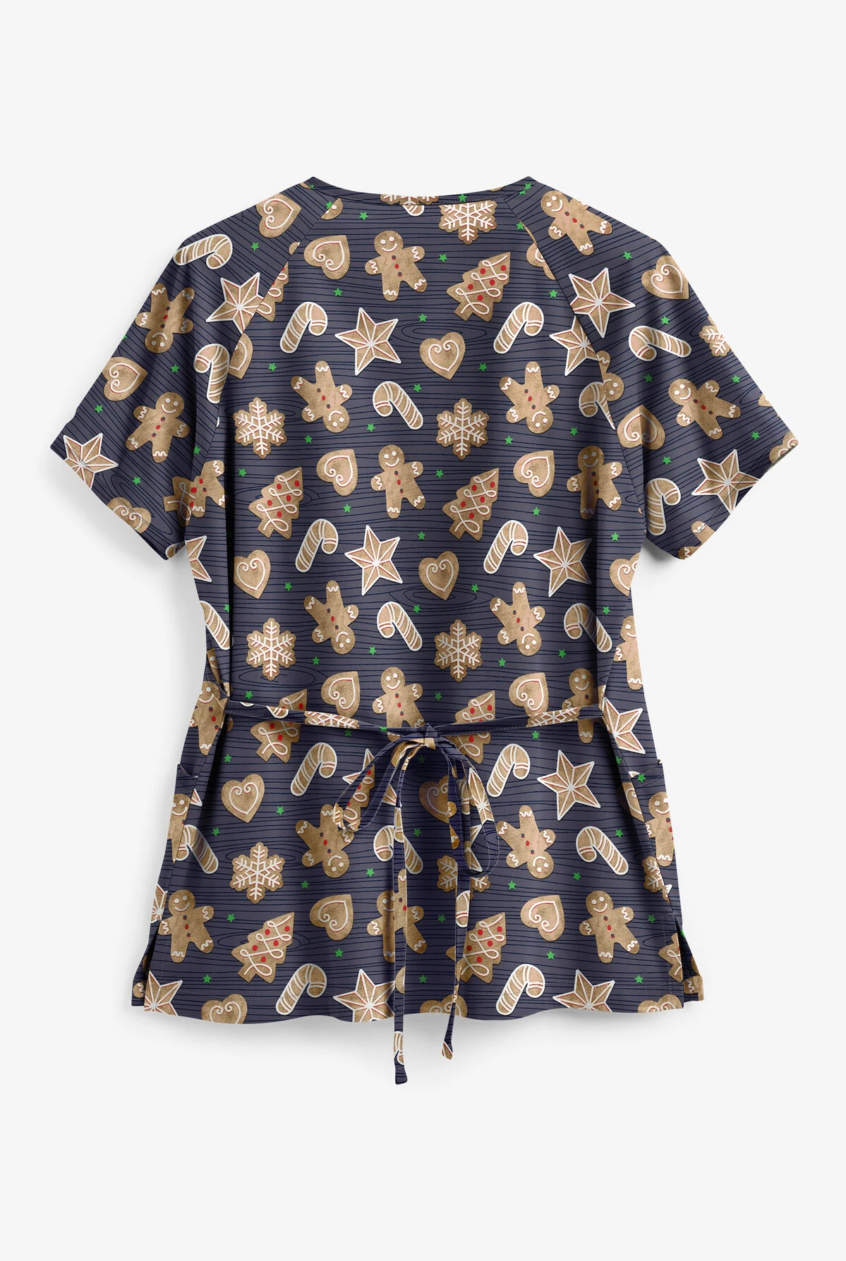 The UA Gingerbread Cookies Granite Mock Wrap Print Scrub Top is the newest addition to our Best Buy Collection, our mock wrap scrub top can be worn without the worry of opening since it has been sewn closed in the front. This mock wrap top can also be cinched as much or as little as you like with the back ties. For storage, there are two front patch pockets. The side slits included allowing for ease of mobility around the office. This scrub top comes in a variety of fade-resistant colors and is made with easy-care wash-n-wear fabric. Fabric content is 55/45 Cotton/Poly.
