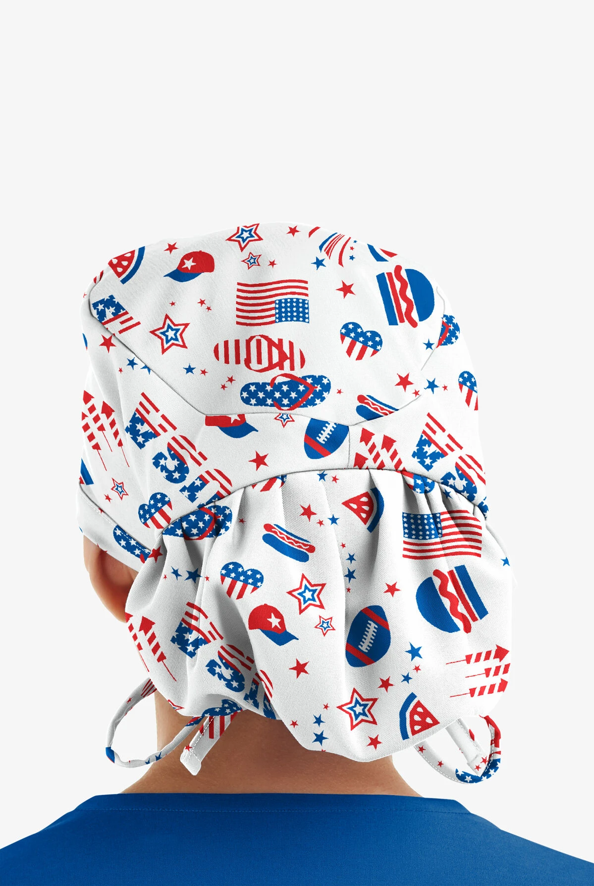 The UA Party in the USA White ladies Surgical Scrub Hat features three piece hat with draw cord ties. Draw cord ties allow for easy adjustment and a comfortable fit. It comes with elasticated pouch at back of hat allows easy storage of hair for full head coverage. Fabric is made up of 55/45 Cotton/Poly. One size fits most.