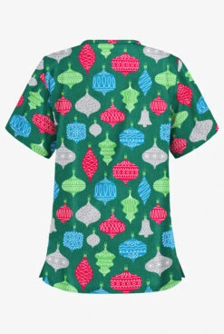 Butter-Soft Festive Ornaments Hunter Women’s 4-Pocket V Notch-Neck Print Scrub Top
