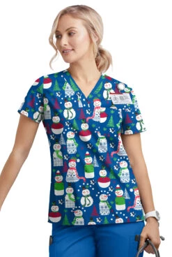 Butter-Soft Juggling Snowman Royal Women’s 1-Pocket V-Neck Tuck-In Print Scrub Top