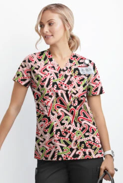 Butter-Soft Noel Candy Canes Women’s 1-Pocket V-Neck Tuck-In Print Scrub Top